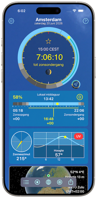 Daarna heb ik alles over de zon toegevoegd, gewoon voor de lol. Je kunt zonsopgang, middag en zonsondergang overal op aarde volgen. Je kunt locaties vergelijken, films maken en rapporten genereren die een locatie naar keuze vergelijken met plaatsen over de hele wereld.