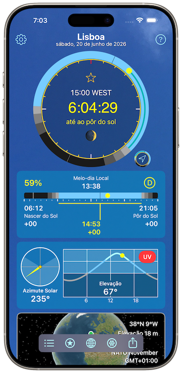 Depois adicionei tudo sobre o sol, só por diversão. Pode monitorizar o nascer do sol, meio-dia e pôr do sol em qualquer lugar da Terra. Pode comparar locais, fazer filmes e gerar relatórios comparando um local que selecionar com lugares de todo o mundo.